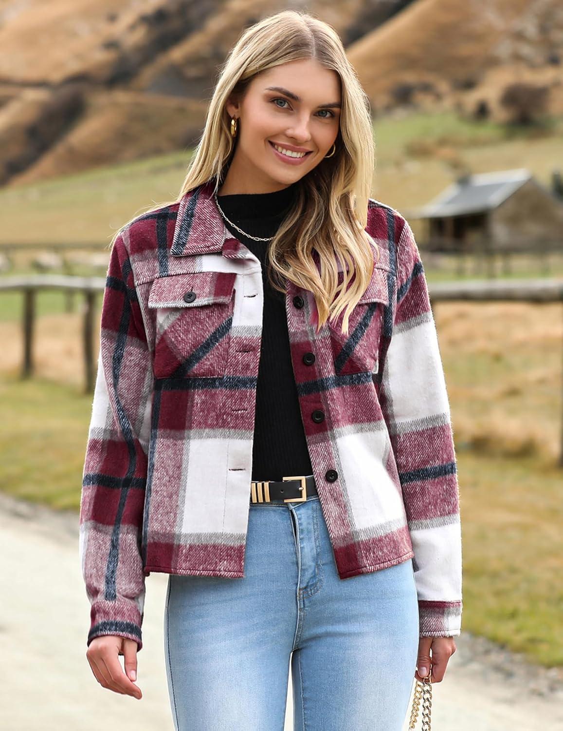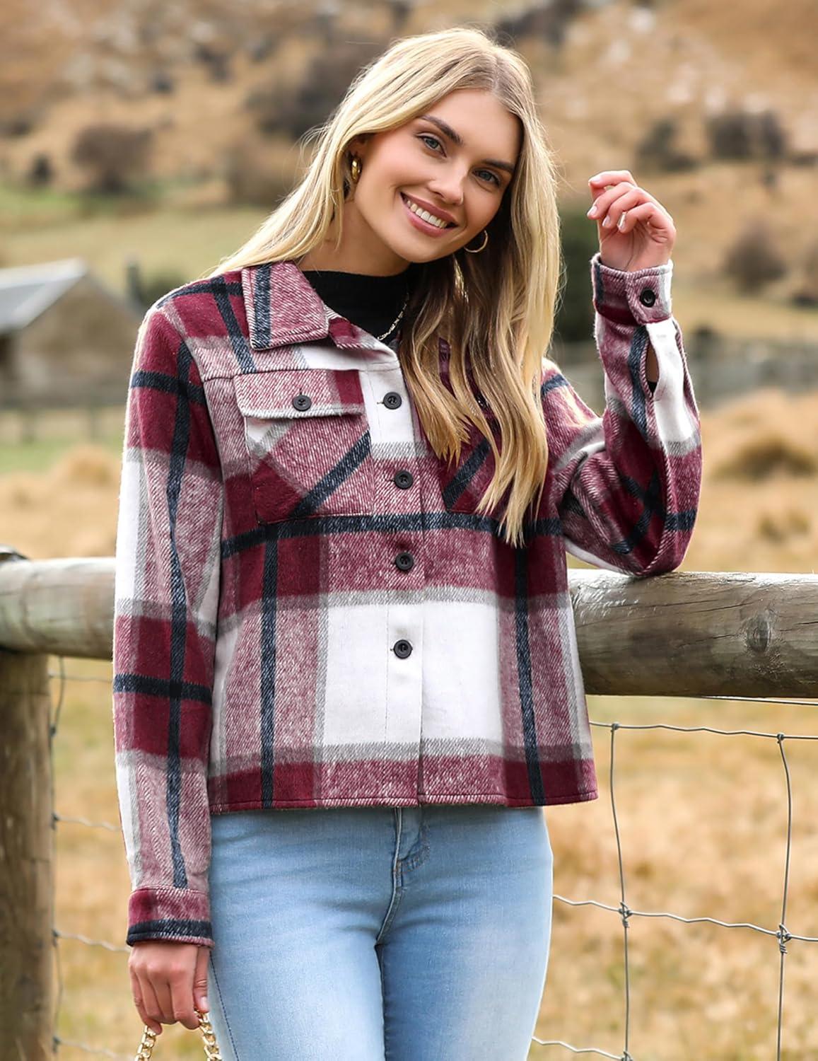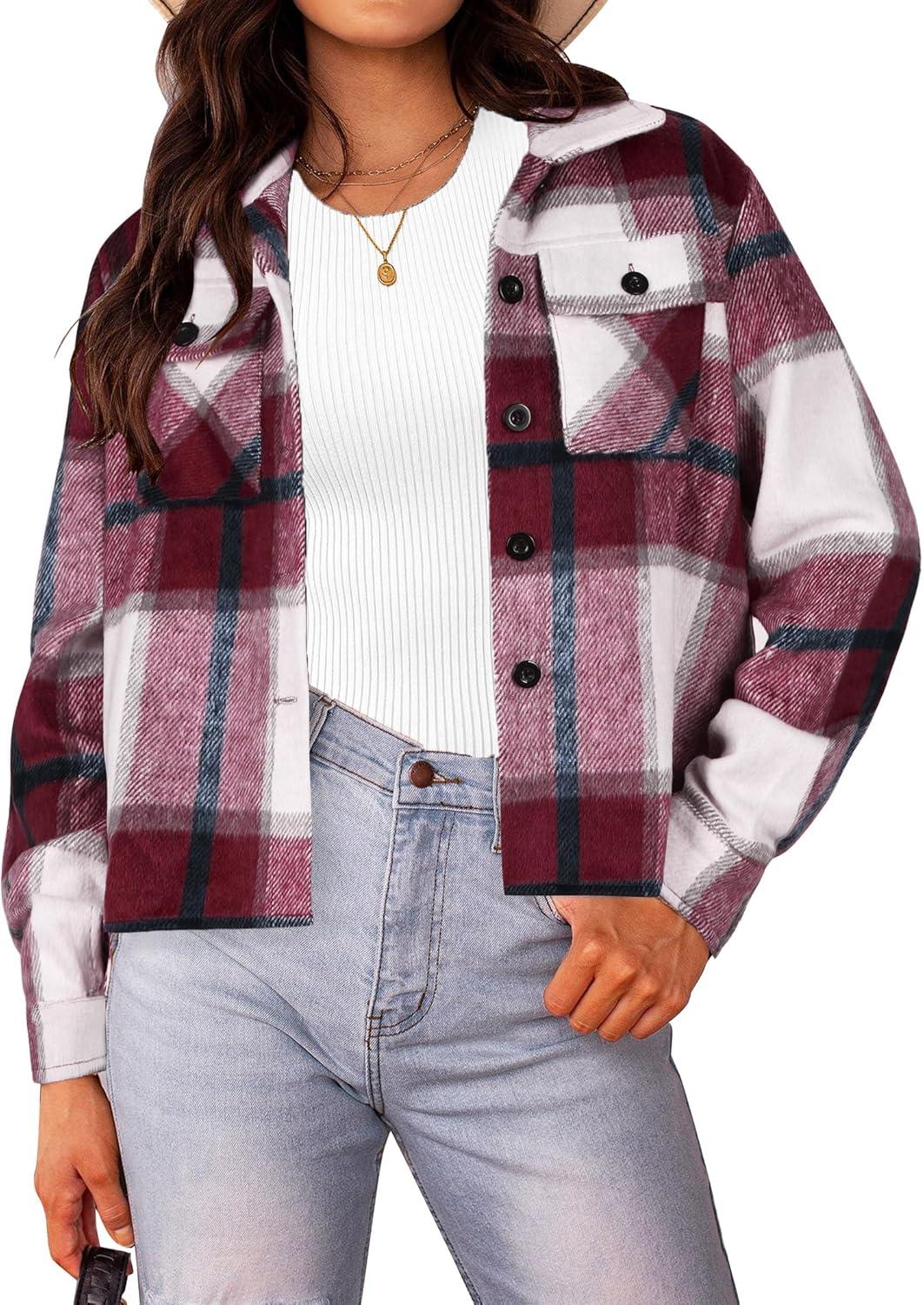 HOTOUCH Womens Flannels Fall Cropped Shacket Plaid Jacket Long Sleeve Button Down Coat 2025 Fall Fashion Trendy Outfits(Red Flannel)