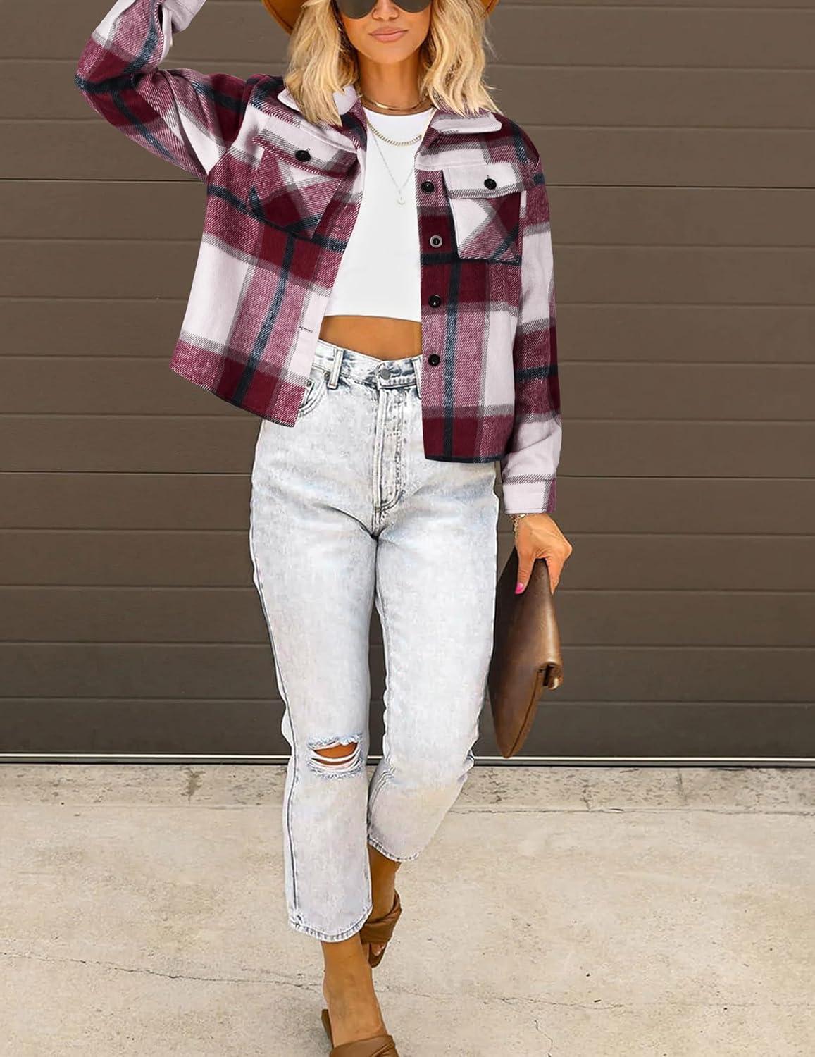 imageHOTOUCH Womens Flannels Fall Cropped Shacket Plaid Jacket Long Sleeve Button Down Coat 2025 Fall Fashion Trendy OutfitsFusica Flannel