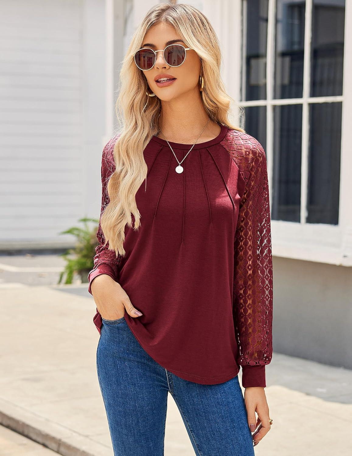 HOTOUCH Womens Lace Short/Long Sleeve Tops Fall Dressy Casual Blouses Business Work Shirts Fashion Clothe Trendy Outfits(A-wine Red (Long Sleeve))