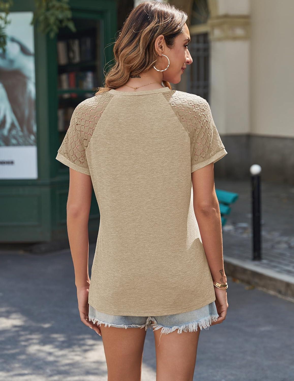 HOTOUCH Womens Lace Short/Long Sleeve Tops Fall Dressy Casual Blouses Business Work Shirts Fashion Clothe Trendy Outfits(Short Sleeve Khaki)