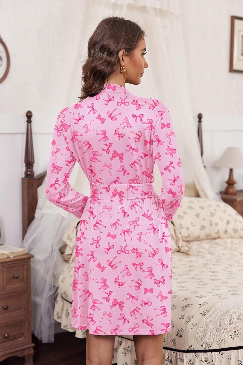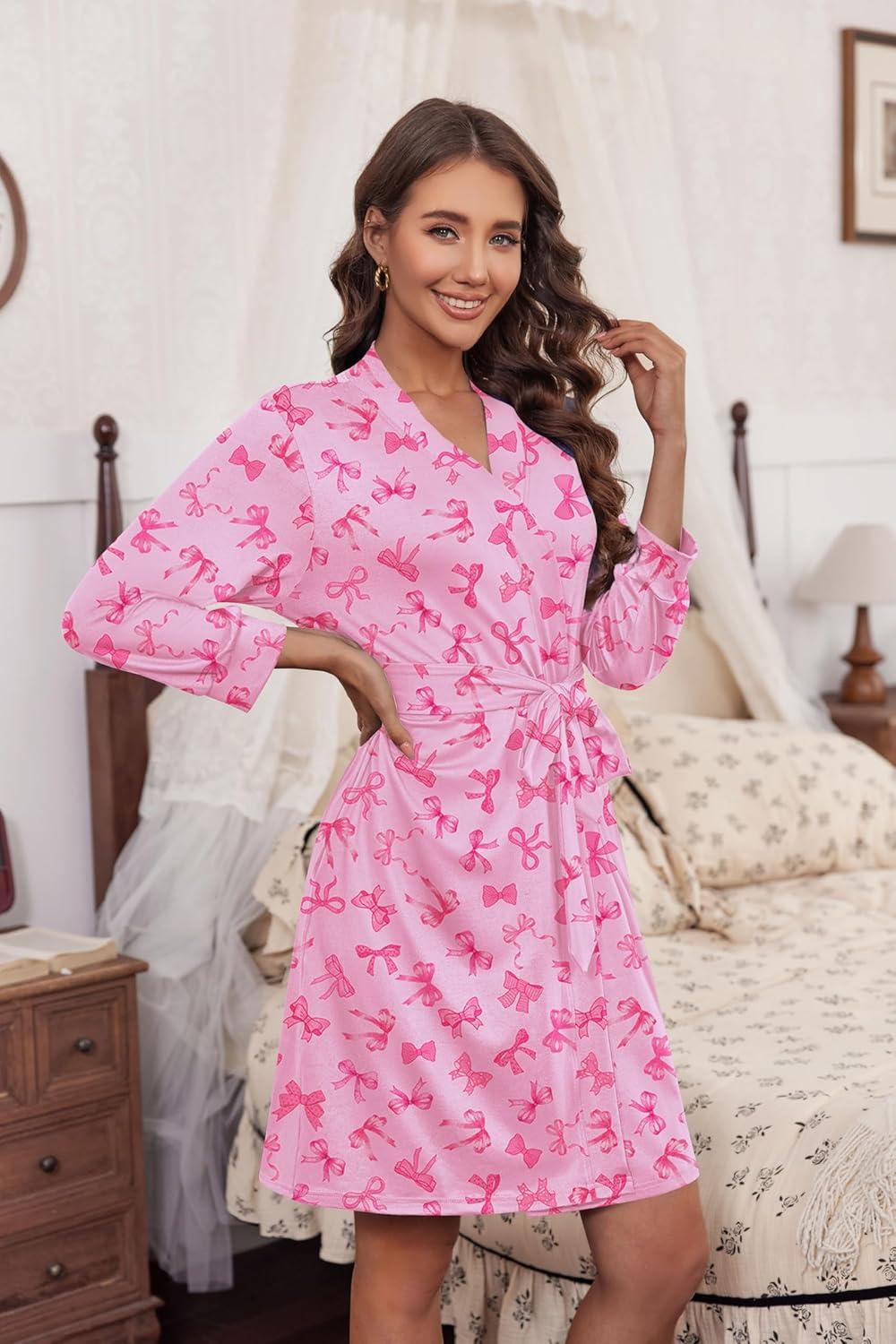 HOTOUCH Womens Robe Lightweight Short Knit Bathrobe Soft Ladies Sleepwear with Pockets(Pink Bow)