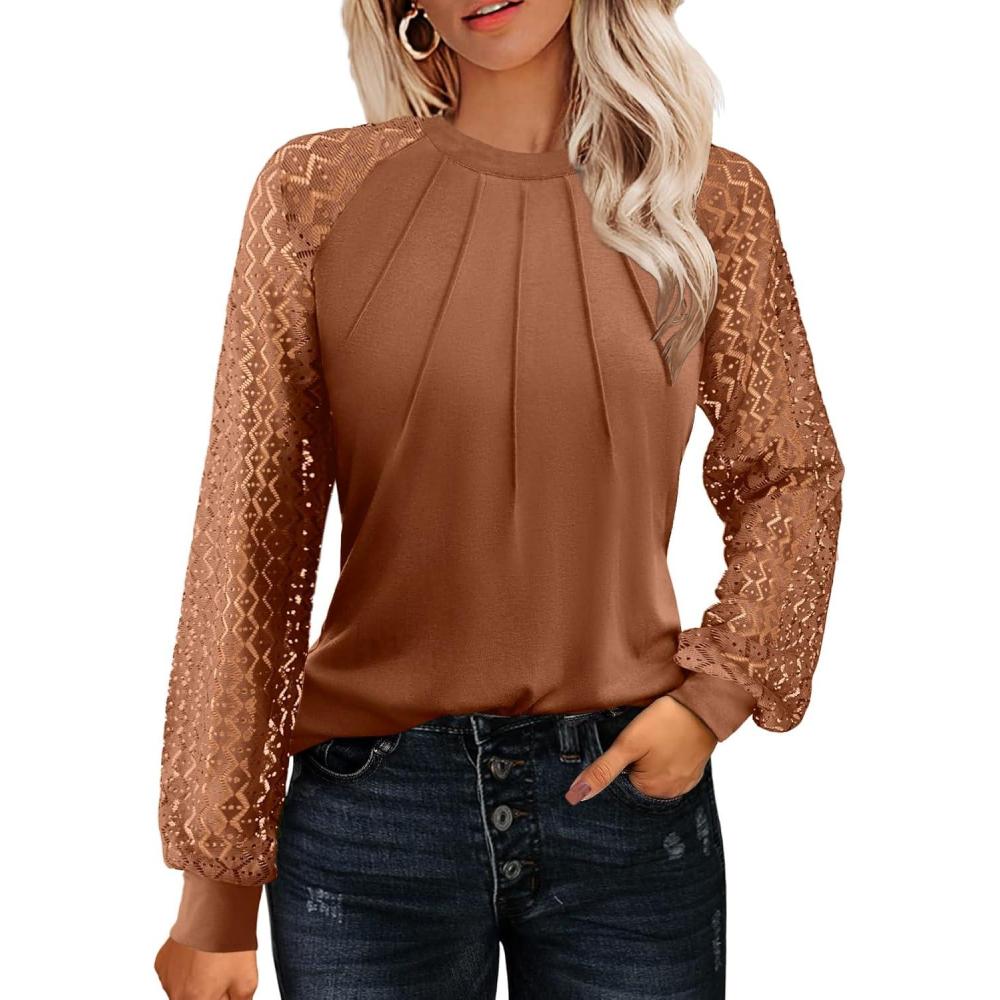 HOTOUCH Women's Short/Long Sleeve Lace Blouse(A-brick Red (Long Sleeve))