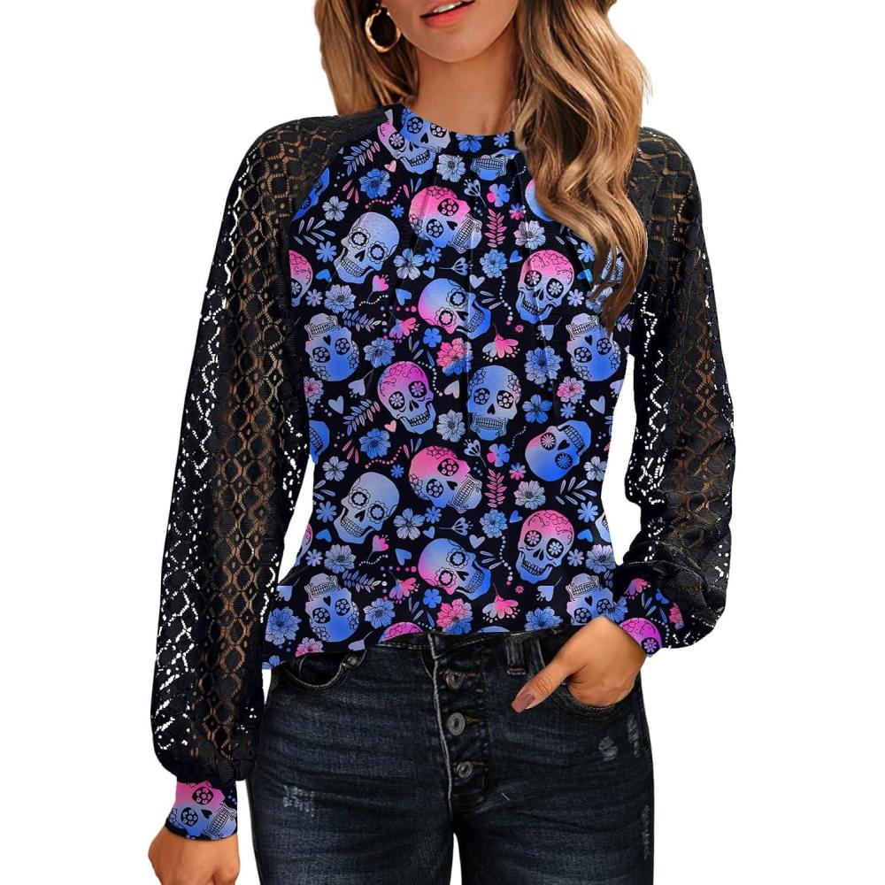 HOTOUCH Women’s Short/Long Sleeve Lace Blouse(Halloween Skull)