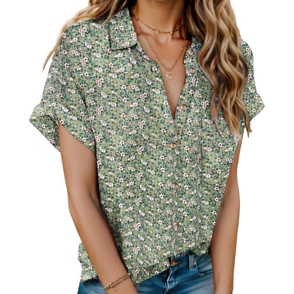 HOTOUCH Women's Short Sleeve Button Down Collared Shirt(Floral Green)