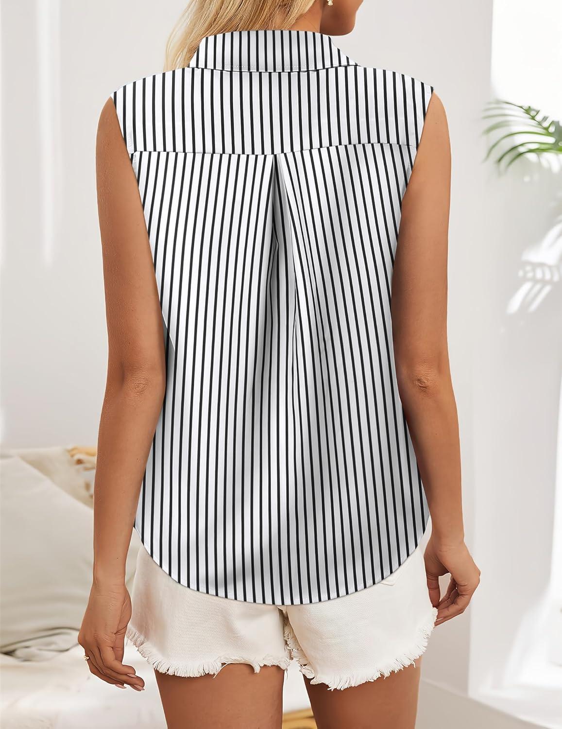 HOTOUCH Womens Sleeveless Button Down Shirt Tops V Neck Business Casual Collared Blouses Tank Top(Black White Striped)