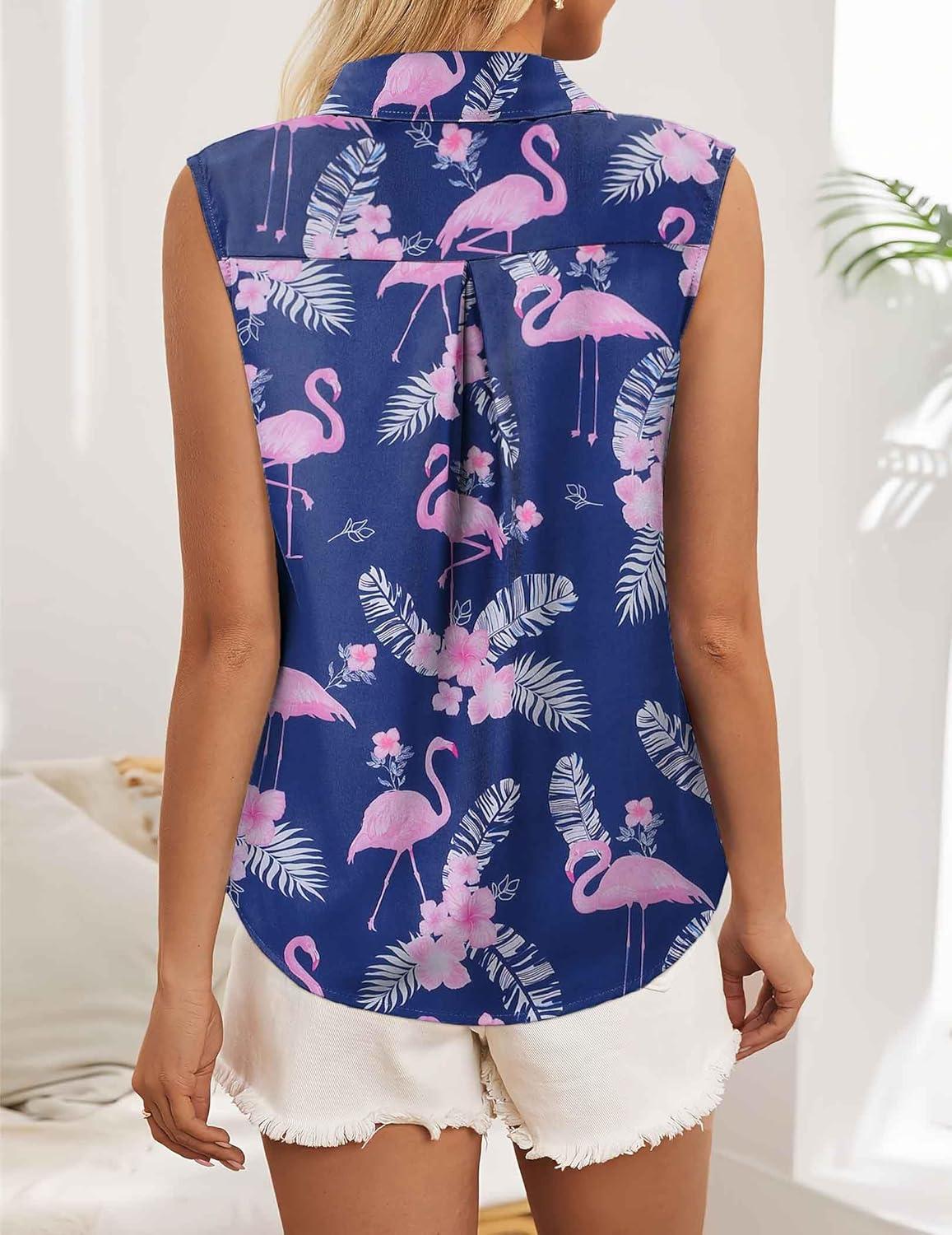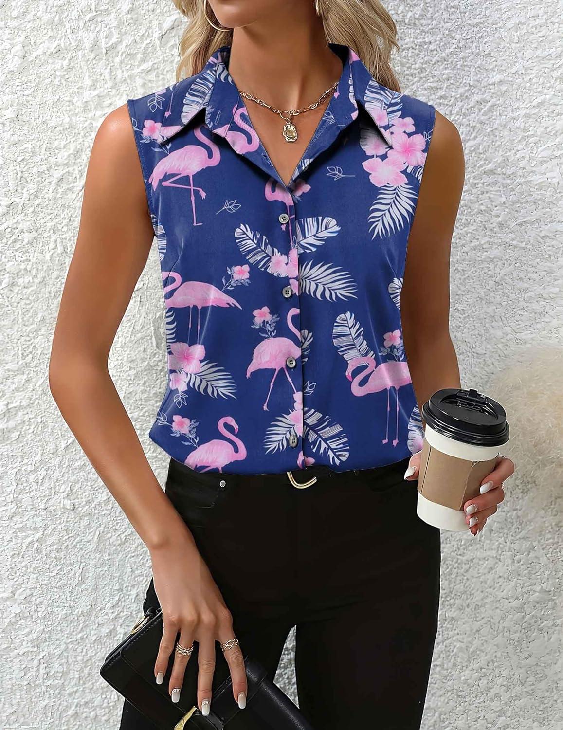 HOTOUCH Womens Sleeveless Button Down Shirt Tops V Neck Business Casual Collared Blouses Tank Top(Navy Flamingo)
