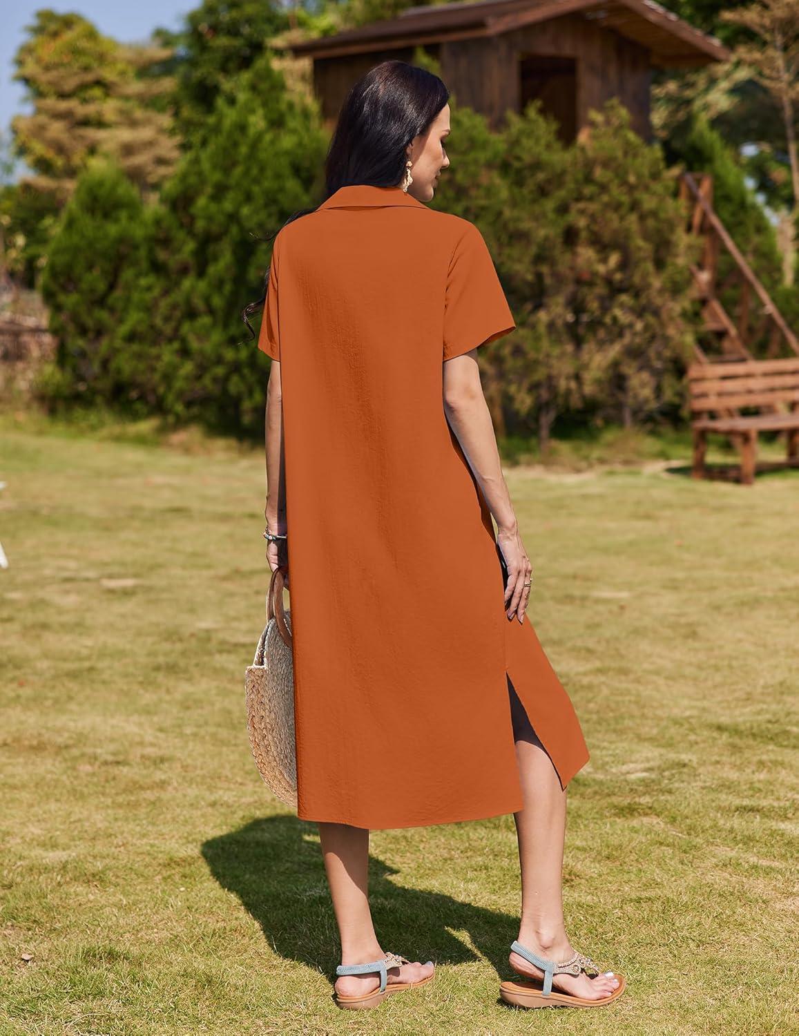 HOTOUCH Womens Summer Dress Casual Midi Short Sleeve Shirt Button Down Loose Beach Dress with Pockets(Brick Red)