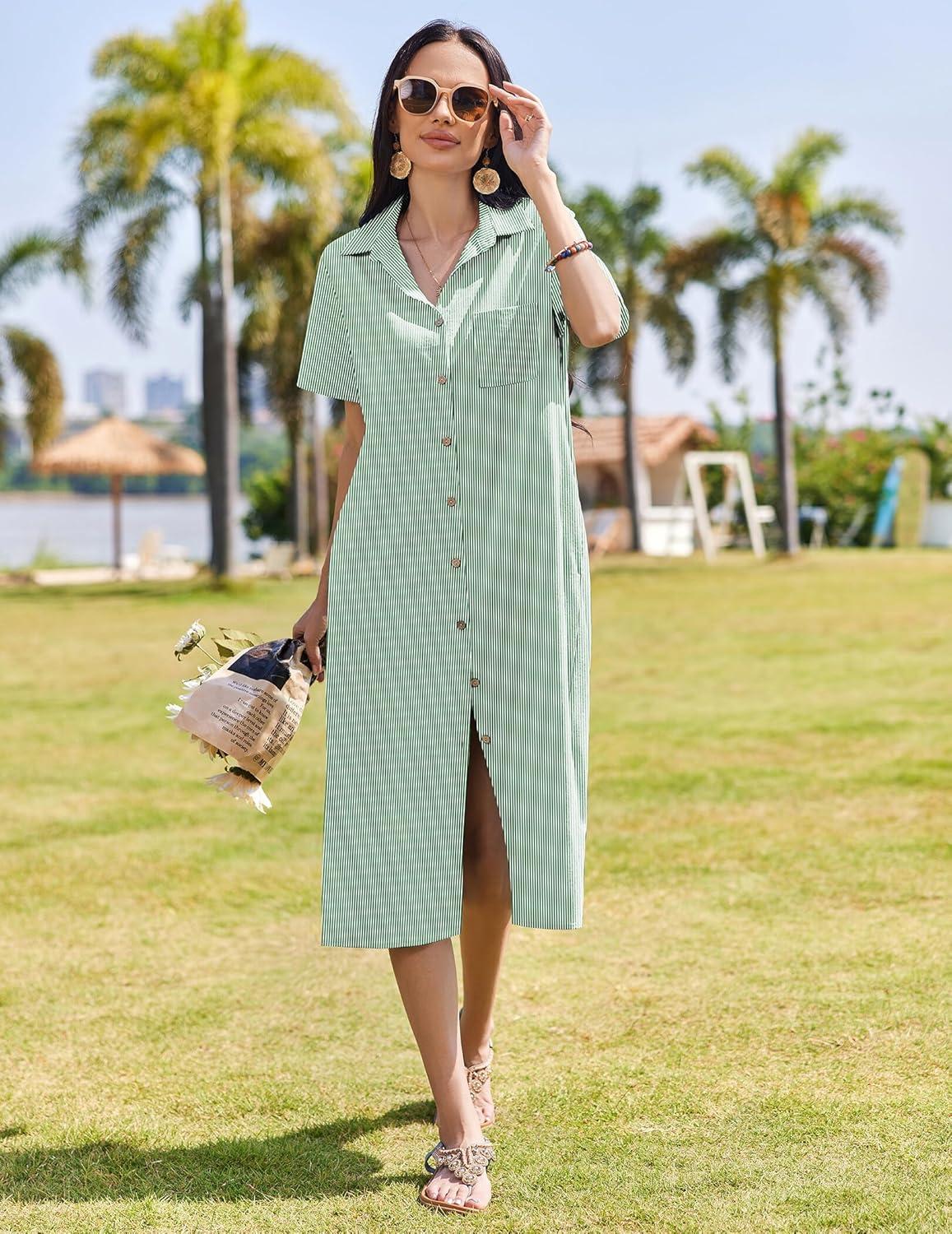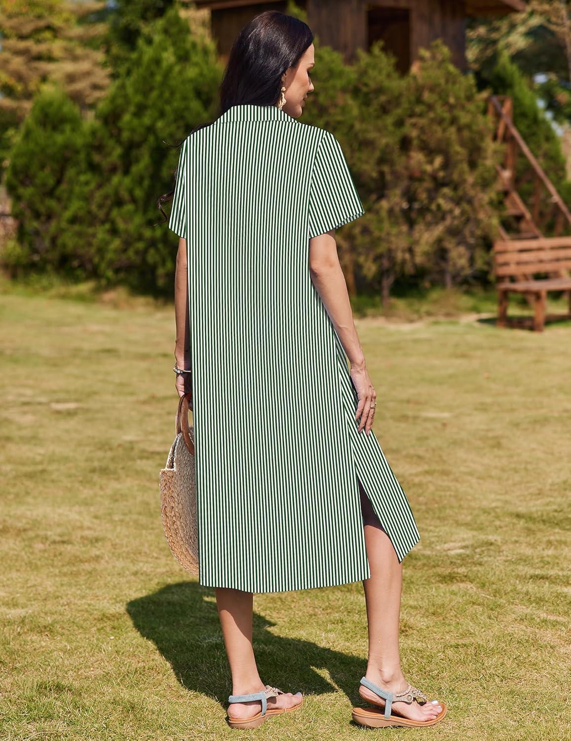 HOTOUCH Womens Summer Dress Casual Midi Short Sleeve Shirt Button Down Loose Beach Dress with Pockets(Green Stripe)