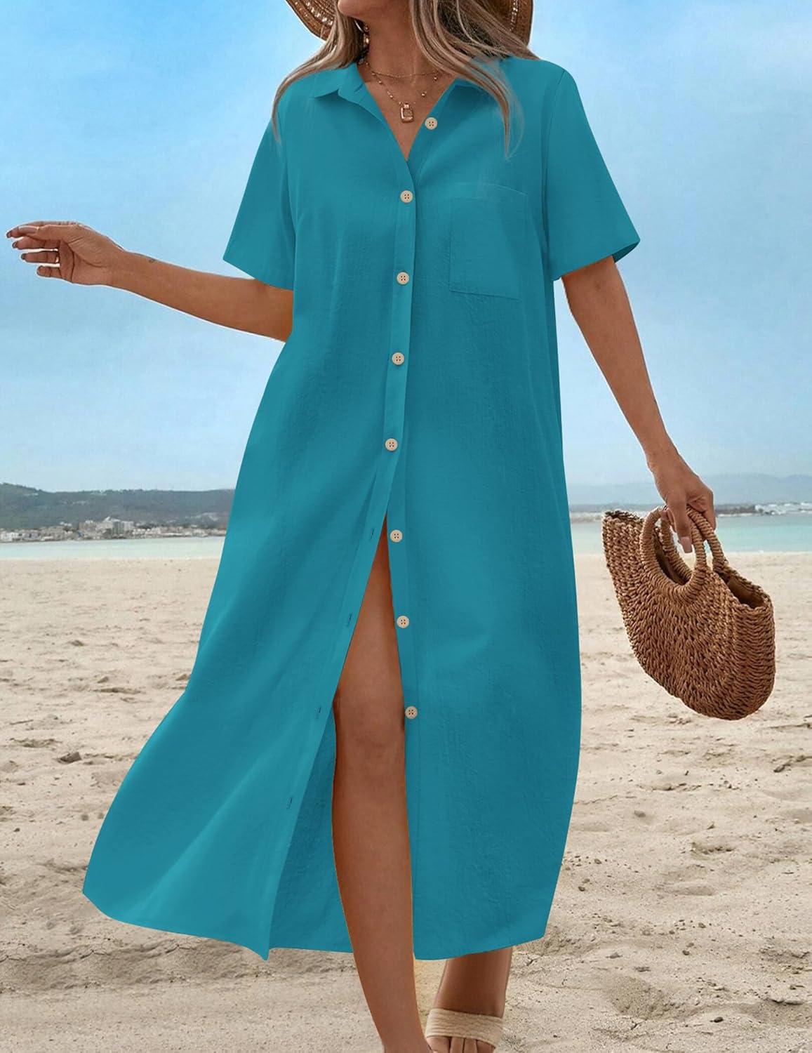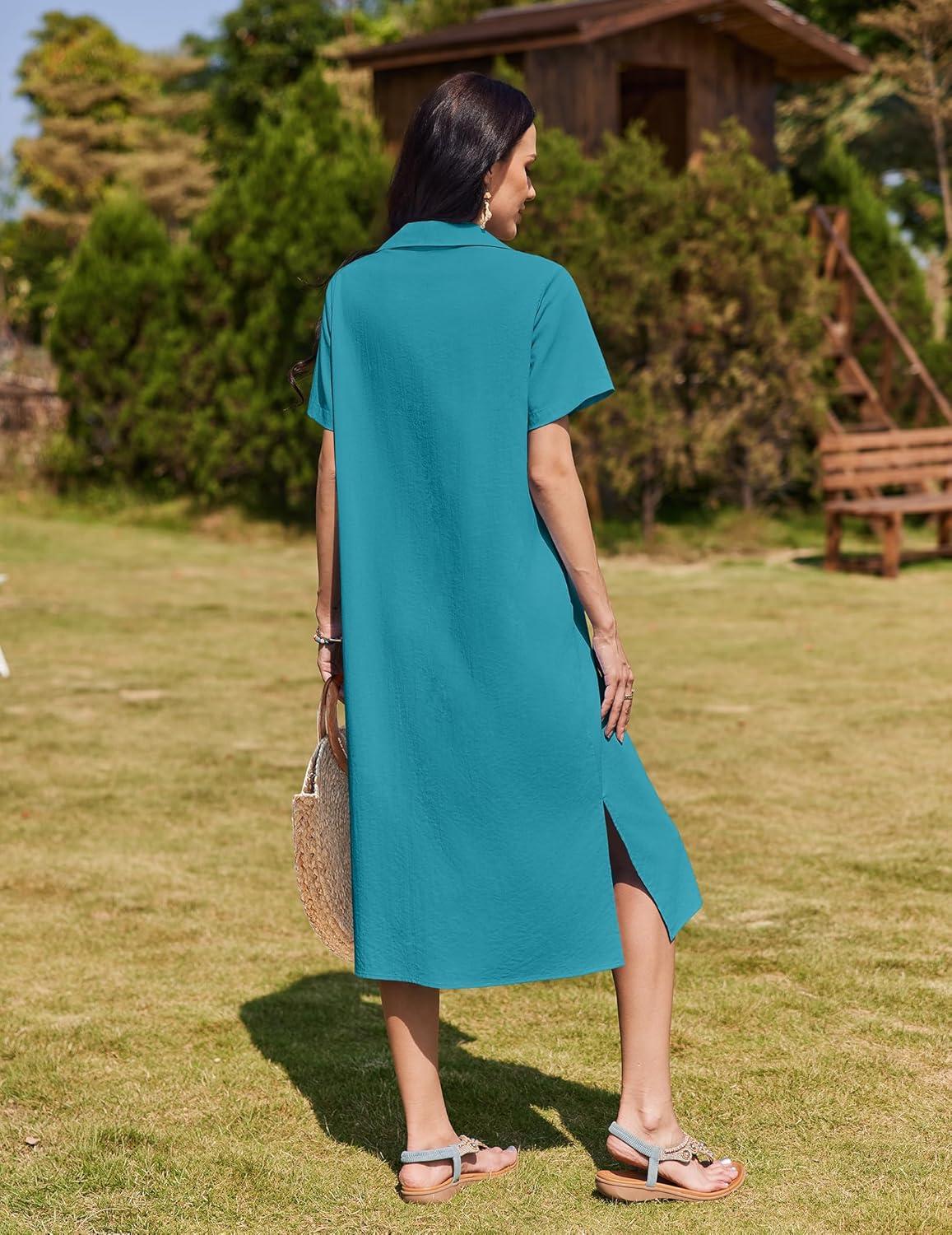 HOTOUCH Womens Summer Dress Casual Midi Short Sleeve Shirt Button Down Loose Beach Dress with Pockets(Lake)
