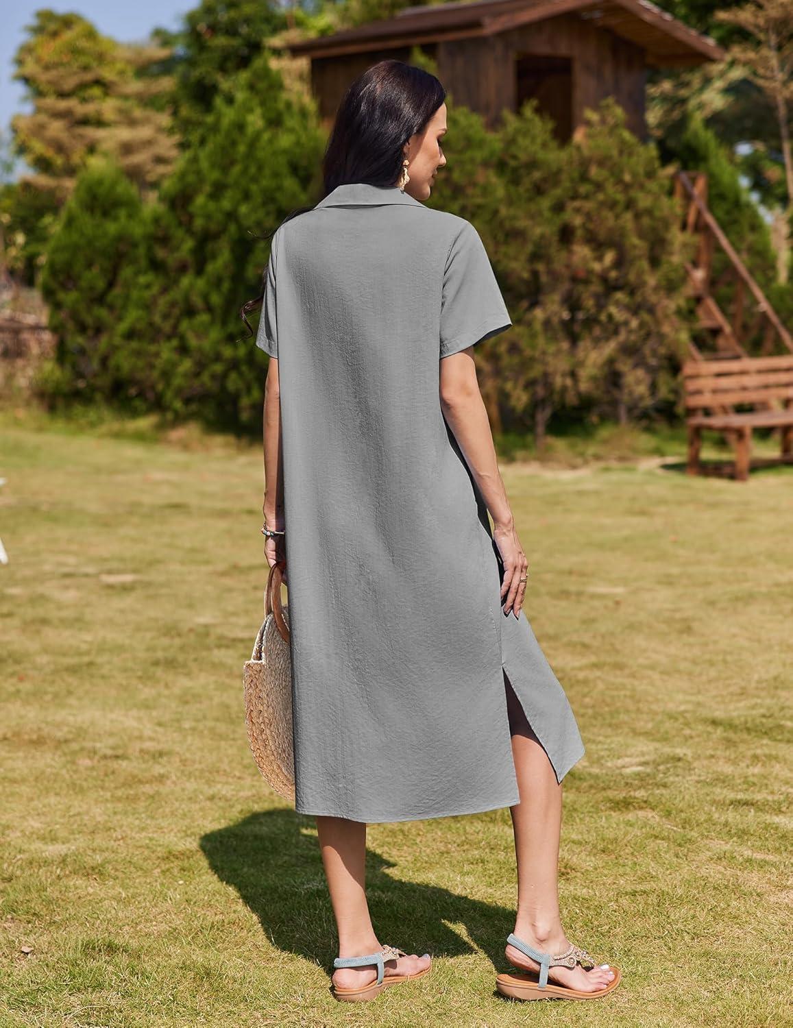 HOTOUCH Womens Summer Dress Casual Midi Short Sleeve Shirt Button Down Loose Beach Dress with Pockets(Light Grey)