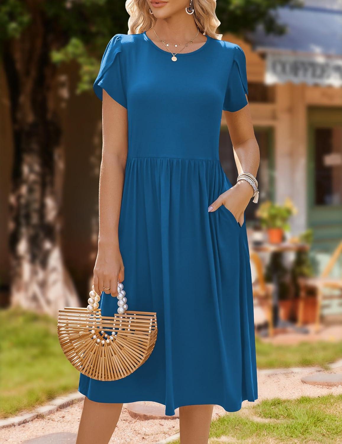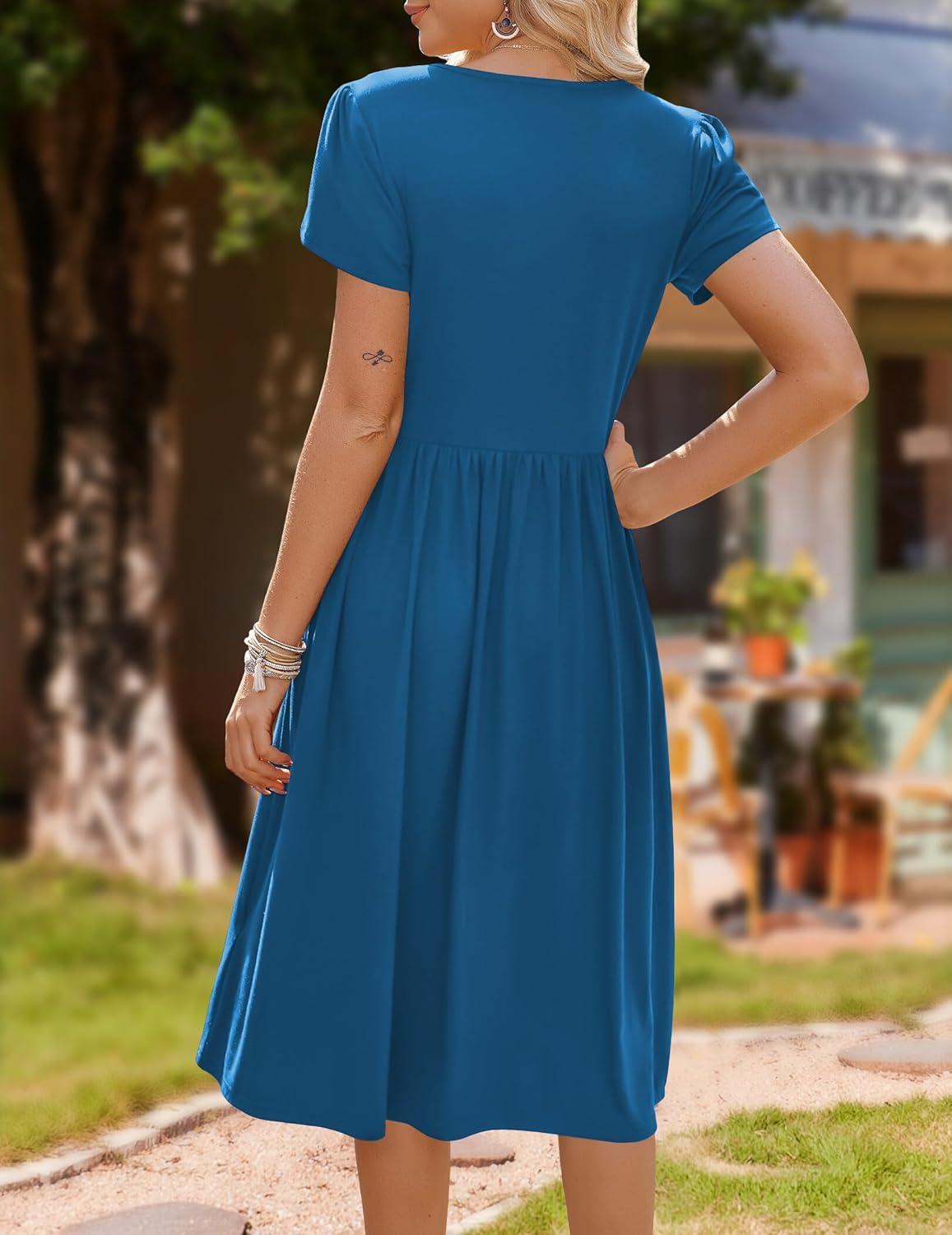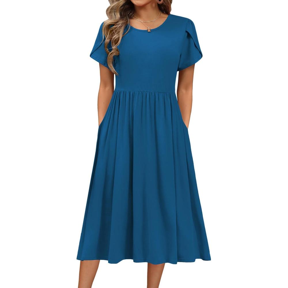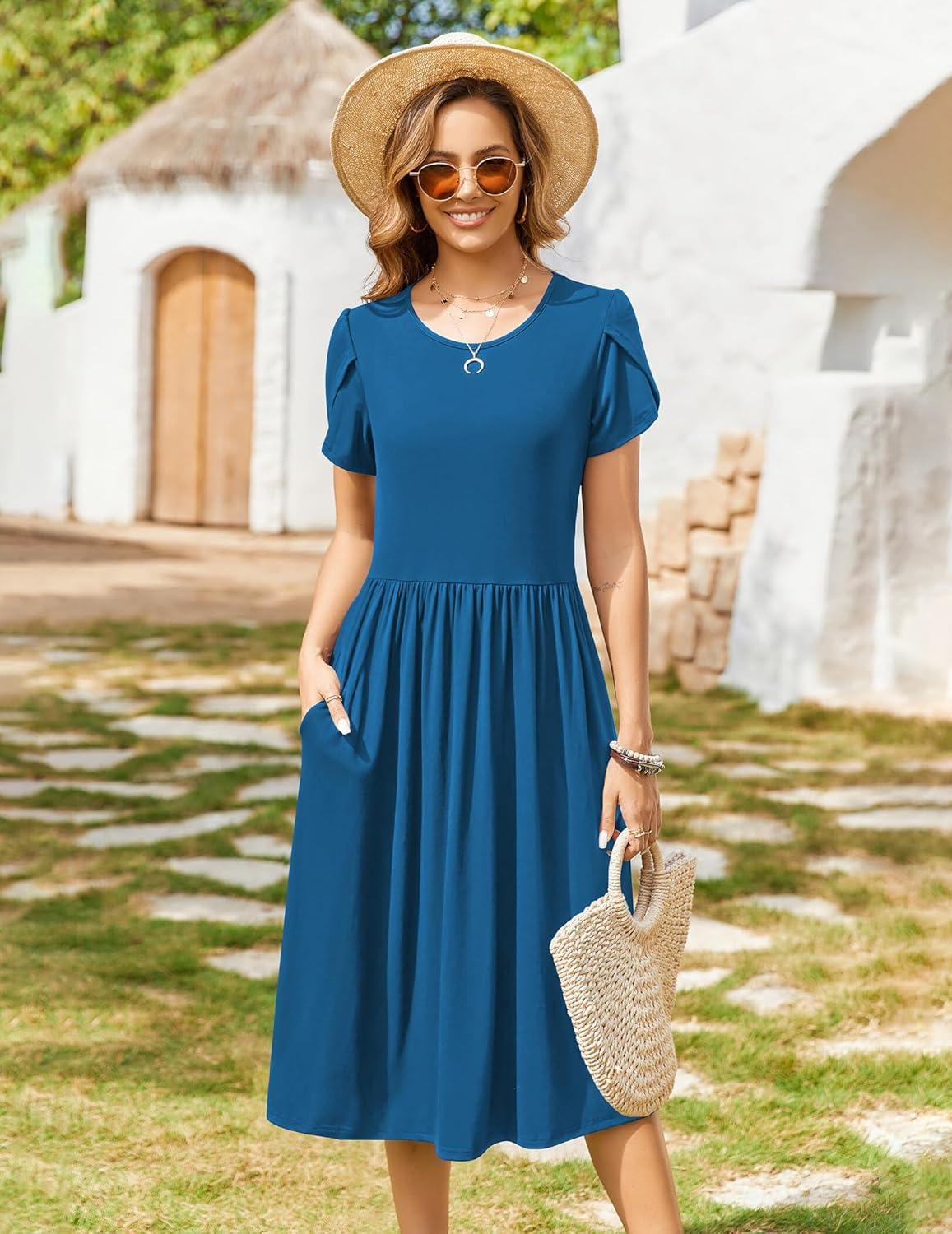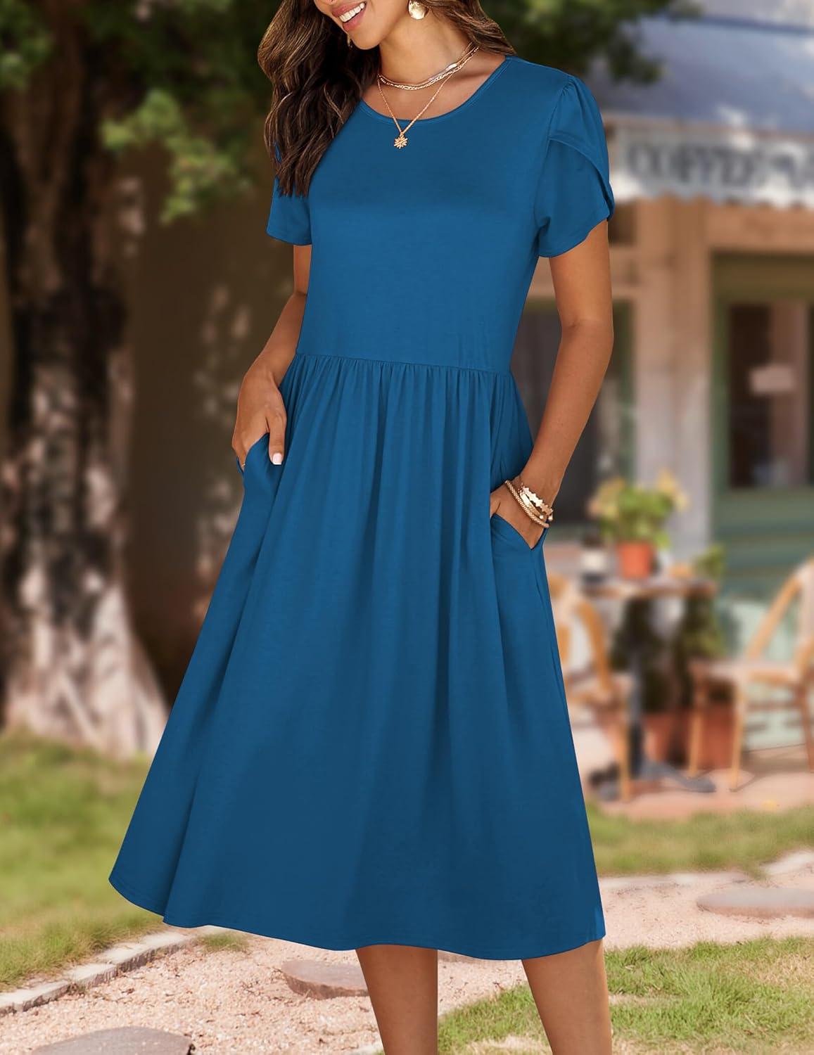 imageHOTOUCH Womens Summer Short Sleeve ALine Midi Dresses Casual Floral TShirt Dress Flowy Beach Sundress with PocketsBlue